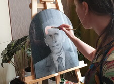 После окончания работы над заготовкой, плита была передана художнице-портретистке, которая и продолжила работу над ним. Для начала она покрыла гранит специальным раствором, на который в дальнейшем и будут наноситься краски.